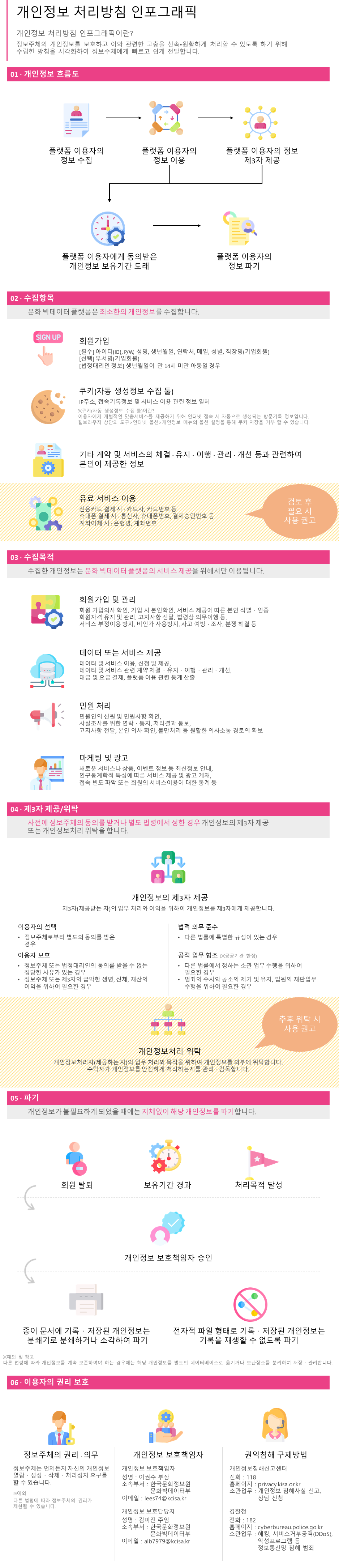 - ② 문화 빅데이터 플랫폼은 다음과 같이 정보주체의 개인정보를 처리합니다. 개인정보 파일별 상세한 내용은 아래의 안내를 통해 확인할 수 있습니다. 개인정보보호 포털(www.privacy.go.kr) → 개인서비스 → 정보주체 권리행사 → 개인정보 열람등 요구 → 개인정보파일 검색 → 기관명에 "한국문화정보원" 입력 후 검색